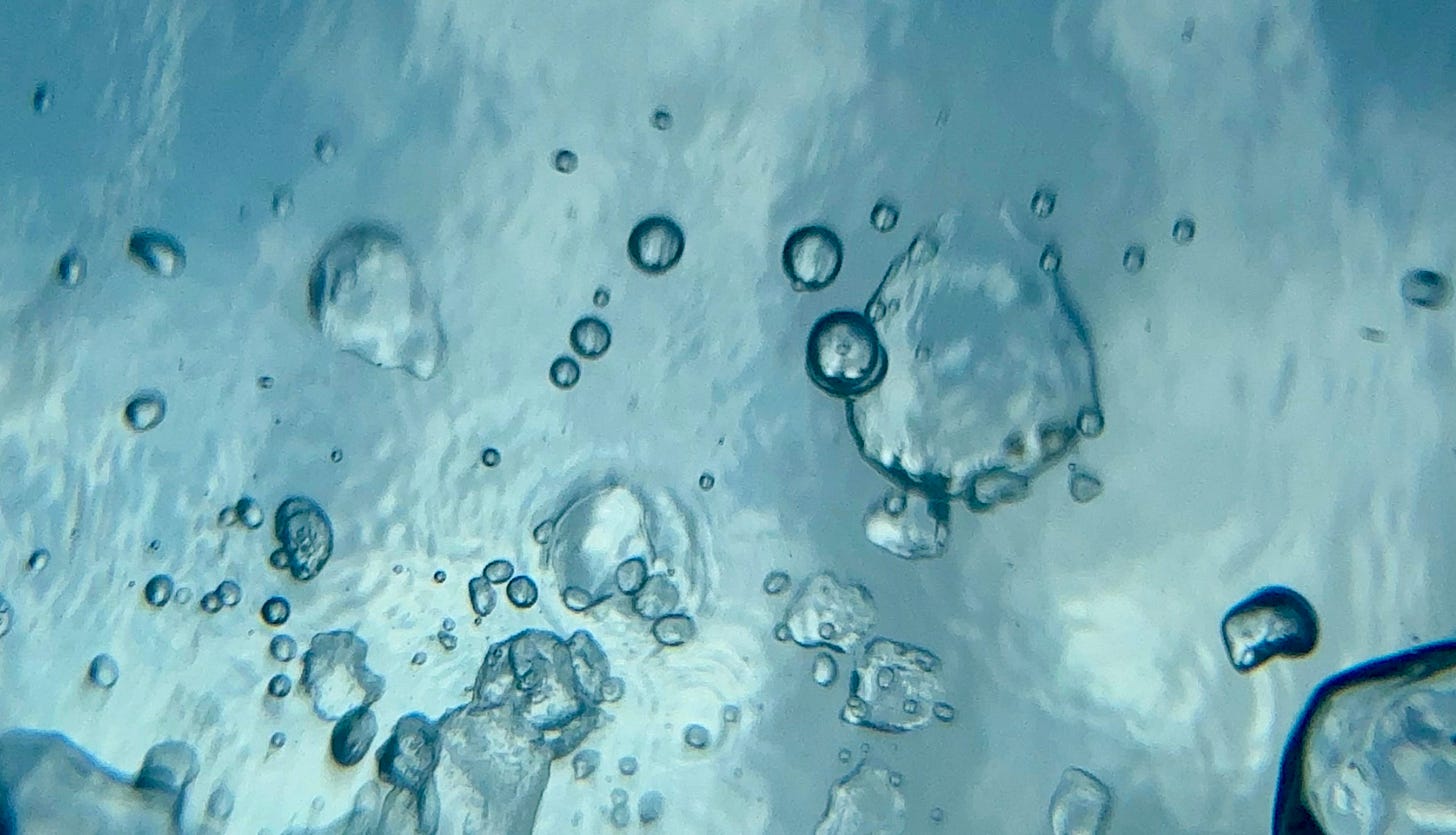From my mouth and nose, bubbles pop and rise. Slowly at first, then faster as I exhale.